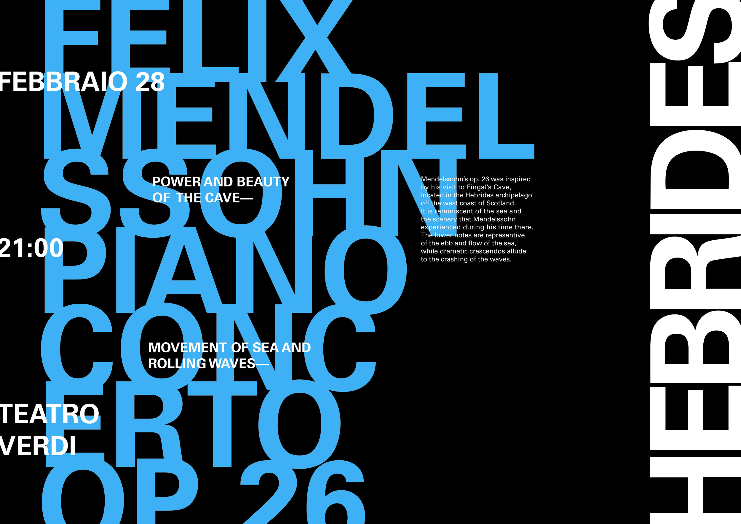 This typographic poster delves into the essence of Felix Mendelssohn's Piano Concerto Op. 26, drawing inspiration from his transformative journey to the Hebrides Islands and the awe-inspiring Fingal's Cave. While the piece doesn't narrate a specific story, it beautifully suggests the sea and Mendelssohn's profound experience. The typographic design conveys this narrative by employing intentional techniques.